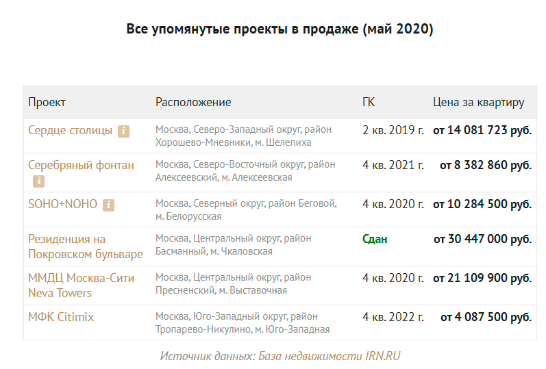 По данным Est-a-tet, в I квартале лучше всего шли продажи апартаментов в проектах «Сердце Столицы», «Level Стрешнево», Neva Towers, Soho+Noho и ЖК «Серебряный фонтан». Средние цены в этих проектах колеблются от 181 300 до 510 300 за кв. м. То есть успешные проекты есть во всех ценовых сегментах – главное адекватное сочетание цены и качества.
