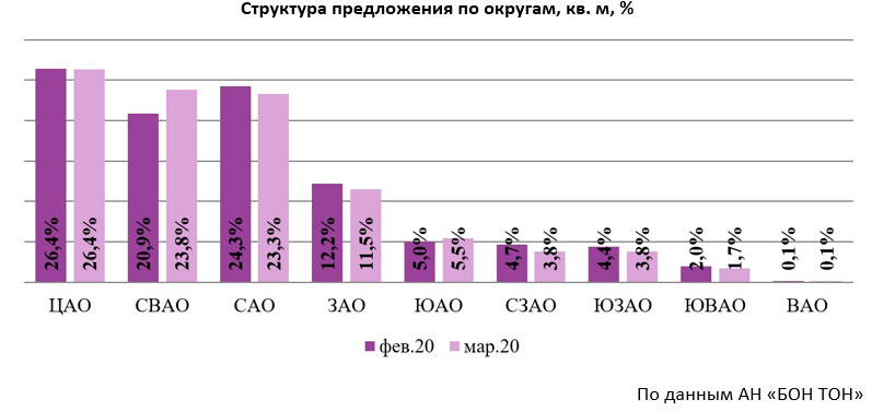 Основное предложение, более 70%, сосредоточено в 3 столичных округах. Лидируют ЦАО с 26,4%, СВАО с 23,8% и САО с 23,3%. За месяц Северо-Восточный округ Москвы показал наибольший прирост, так как вышли новые объемы апартаментов в продажу. Доля увеличилась с 20,9% до 23,8%, а экспозиция на 16,3%. Во всех остальных локациях за месяц наблюдалось сокращение экспозиции на 2,2 -17%.