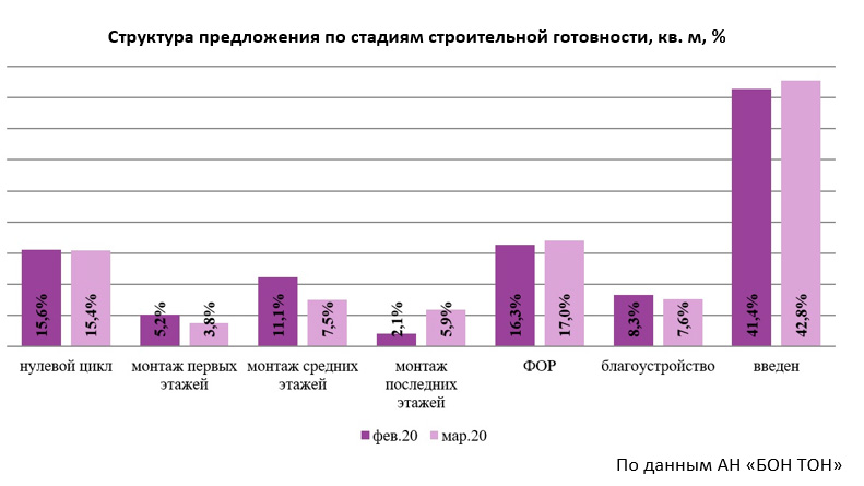 Невысокие темпы выхода нового предложения приводят к тому, что апартаменты становятся рынком готовых новостроек. Порядка 17% экспозиции находится на стадии фасадно-отделочных работ (ФОР), 7,6% - на этапе благоустройства и 42,8% относится к введенным объемам. Суммарно это почти 70% от общей суммы площадей в сегменте апартаментов. На начальной стадии (котлован и первые этажи) находится всего 19,2% предложения.