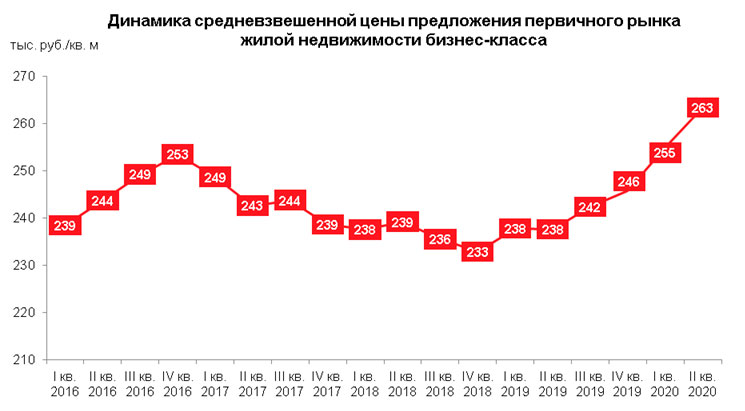 Аналитики департамента проектного консалтинга Est-a-Tet подвели итоги II квартала 2020 года на рынке столичных новостроек бизнес-класса и выяснили, как за этот период скорректировались цены, а также проследили динамику спроса. Средняя цена предложения в сегменте бизнес продолжила расти: по сравнению с предыдущим кварталом повышение составило 3,3%, и сейчас показатель находится на уровне 263 тыс. руб./кв. м, а прирост в годовой динамике достиг 10,8%.
