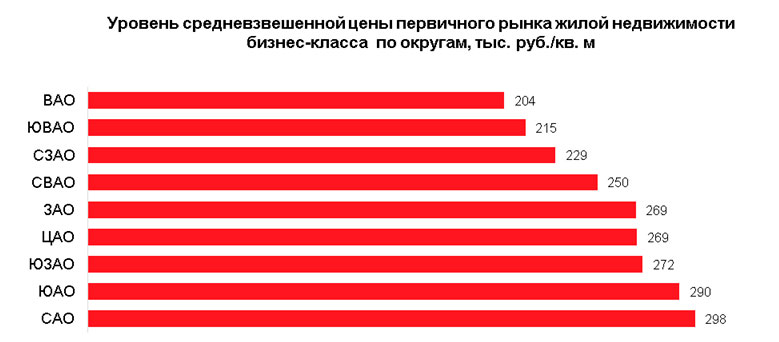 Минимальный уровень цен относится к ВАО – 204 тыс. руб./кв. м, а также ЮВАО, в котором средняя стоимость находится на уровне 215 тыс. руб./кв. м. Самым дорогим традиционно остается САО с показателем 298 тыс. руб./кв. м, в данной локации ряд проектов по своим качественным характеристикам приближены к премиум-классу, а значительный объем в них находится на высокой стадии строительства.
