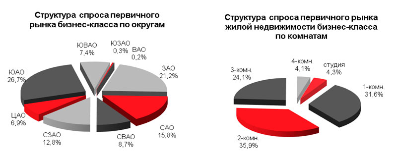 Существенная доля спроса приходится на три округа: ЗАО (21,2% реализованных площадей), САО (15,8%) и ЮАО (26,7%). При этом основной объем продаж приходился на двухкомнатные и однокомнатные квартиры – 35,9% и 31,6% соответственно.
