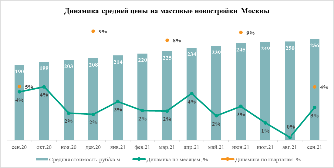 В сентябре средняя цена квадратного метра на рынке массовых новостроек Москвы достигла 256 тыс. рублей, что на 4,5% больше, чем в июне, в последний месяц субсидирования ипотеки в Москве, подсчитали эксперты «Метриум». Замедление роста цен было отмечено только в июле и августе. При этом за III квартал количество заключенных договоров долевого участия в Москве упало на 14,8% относительно прошлого квартала.