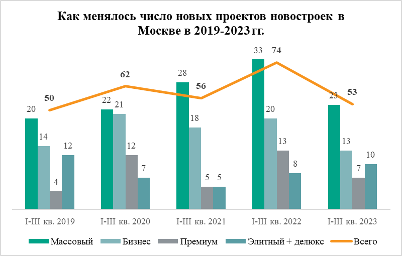 По подсчетам экспертов «Метриум», с января по сентябрь 2023 года московские застройщики начали реализацию 53 проектов, что на 28% меньше, чем в аналогичный период 2022 года. Повысили активность только девелоперы проектов элитного и делюкс-сегмента.