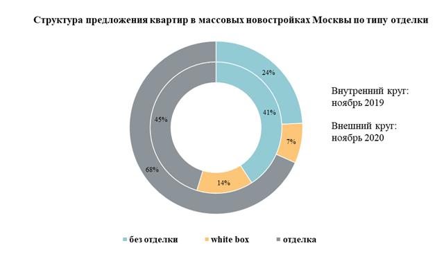 Быстрый рост предложения квартир с отделкой произошёл в последние 12 месяцев. В ноябре 2019 года с отделкой продавались 45% объектов, в формате white box – 14%, а без отделки – 41%.