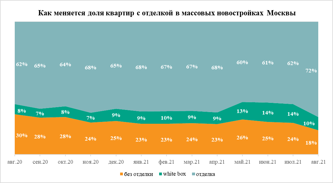 В абсолютном выражении число квартир с разной степенью готовности к заселению изменилось следующим образом. Число квартир с отделкой увеличилось с августа 2020 года с 9,9 тыс. до 11,7 тыс., то есть на 19%. Предложение формата white box в массовых новостройках повысилось на 34%. Жилья без отделки в продаже стало меньше на 38% (3 тыс. квартир сейчас против 4,8 тыс. в августе 2020 года).