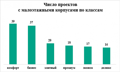Проекты с малоэтажными корпусами равномерно распределены в разрезе сегментов. Согласно подсчетам аналитиков Regions Development и «Метриум», среди них 17 комплексов относятся к эконом-классу, 39 – к комфорт-классу, 37 – к бизнес-классу, 18 – к премиум-классу, 20 – к элитному классу, 16 – к делюкс-классу.
