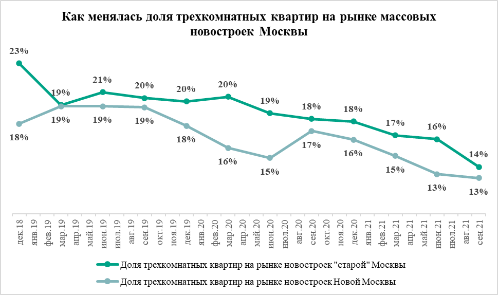 Похожая тенденция наблюдается и в Новой Москве. Здесь в сентябре застройщики продавали 9,8 тыс. квартир. Из них 1,3 тысячи – трехкомнатные. За прошедший квартал их число снизилось на 12%. Таким образом, сейчас на долю трехкомнатных квартир в Новой Москве приходятся 13% предложения жилья. Это всё еще больше, чем у студий (11%), но меньше, чем у однокомнатных квартир (41%) и двухкомнатных (34%). Два года назад трёхкомнатные квартиры составили 19% рынка, студии – 10%, однокомнатные квартиры – 30%, а двухкомнатные – 38%. Как и в «старой» Москве, в Новой Москве маленьких квартир становится больше, чем сравнительно больших.