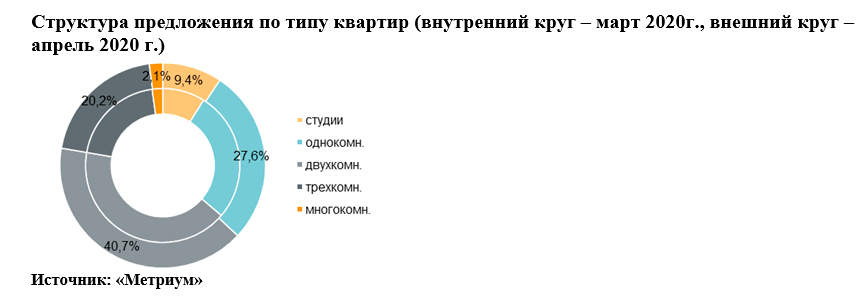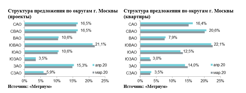 По данным «Метриум», по итогам апреля 2020 года на первичном рынке жилья массового сегмента г. Москвы в реализации находилось 85 проектов. Общий объем предложения составил около 14 1951квартир (830,6 тыс. кв. м.). В сравнении с предыдущим месяцем он увеличился на 6,2% по количеству лотов и на 5,6% по продаваемой площади.