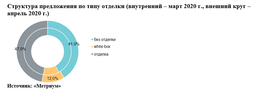 В апреле 2020 года преобладающий объем квартир представлен в домах на стадии отделочных работ (35,8%). По сравнению с предыдущим месяцем их доля увеличилась на 2,4 п.п. Почти треть рынка занимают лоты в корпусах на этапе монтажа этажей (29,5%; -1,0 п.п.). Предложение в новостройках на начальной стадии строительной готовности занимает 22,3% (-0,1 п.п.) рынка. На квартиры в готовых домах приходится наименьшая доля (12,4%; -1,3 п.п.).