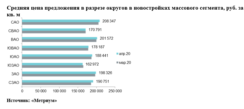 По подсчетам аналитиков «Метриум», в апреле 2020 года на рынке новостроек массового сегмента средняя цена предложения увеличилась на 0,9% и составила 187 560 руб. за кв. м. Рост цен в пределах 0,1-2,9% отмечен во всех округах, за исключением ЮЗАО, где средняя цена сократилась на 1,1%. На снижение цены в округе повлияло изменение структуры экспозиции (уменьшение объема реализации недорогого предложения).