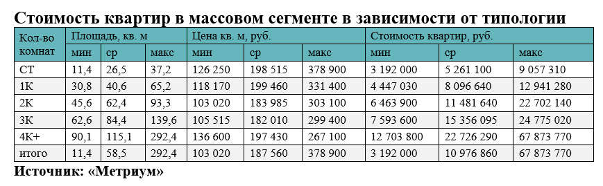 В апреле бюджет квартир массового сегмента составил в среднем 11 млн руб., что больше значения за март на 0,4%. Снижение показателя было зафиксировано только в студиях – на 2,5%. По всем остальным типологиям был отмечен рост в пределах 0,9-1,5%: в однокомнатных квартирах – на 0,9%, двухкомнатных – на 1%, трехкомнатных – на 1,1%, многокомнатных – на 1,5%.