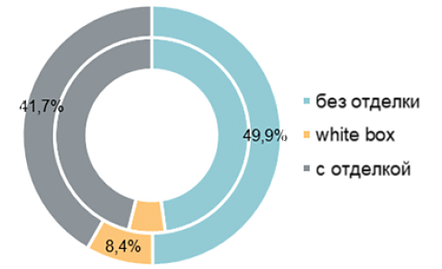 К концу 2020 года в Новой Москве отчётливо заметен «антитренд предложения с отделкой» относительно рынка Москвы в старых границах. Доля квартир без отделки составляет 49,9% и демонстрирует положительную динамику (+2,1 п.п. за год), а на квартиры с отделкой приходится всего 41,7% рынка (-4,4 п.п. за год). Доля квартир с отделкой white box – 8,4% (+2,3 п.п. за год).
