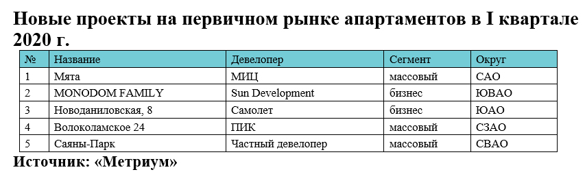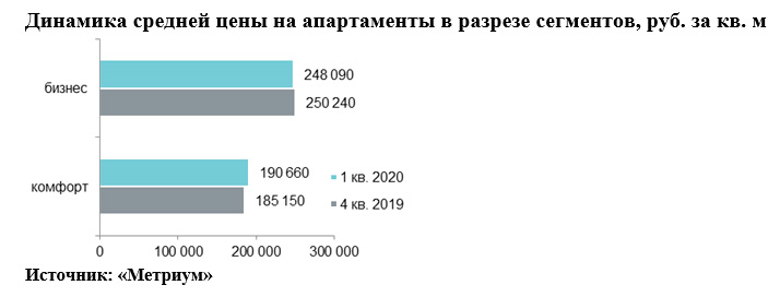 «В I квартале 2020 года рынок апартаментов массового и бизнес-сегмента оставался стабильным, – комментирует Мария Литинецкая, управляющий партнер компании «Метриум» (участник партнерской сети CBRE). – В отличие от рынка квартир, снижения девелоперской активности в сегменте апартаментов пока не произошло. Продажи открылись в пяти новых комплексах, среди которых объекты таких компаний, как «ПИК», «Самолет», «МИЦ». В I квартале 2019 года на рынок вышел только один проект, в аналогичном периоде 2018 года – пять.