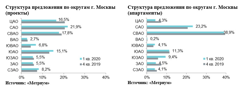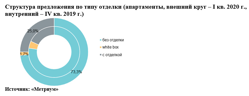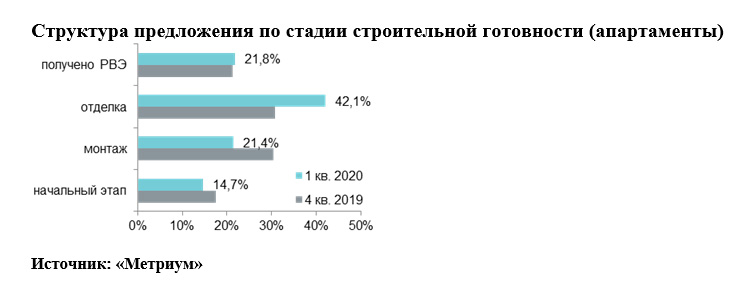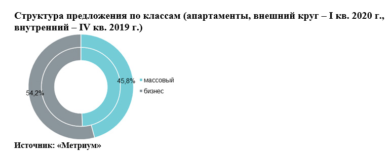 По данным «Метриум», в I квартале 2020 года открылись продажи в пяти апарт-комплексах массового и бизнес-сегмента. Число проектов на рынке достигло 73, однако объем предложения по количеству лотов увеличился только на 1,1% – до 7 440 апартаментов (429,1 тыс. кв. м).