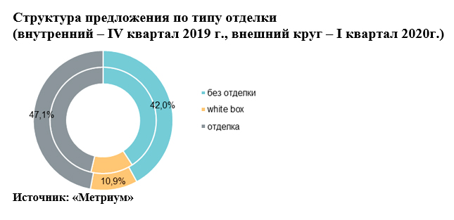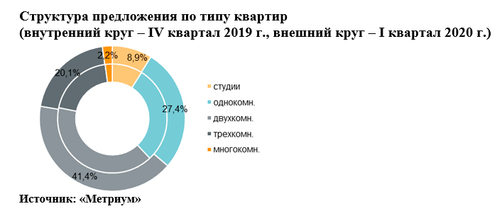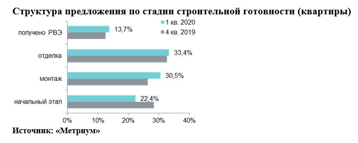 По итогам I квартала 2020 года основной объем предложения был распределен между корпусами на этапе возведения этажей и на стадии отделочных работ – 30,5% (+4,1 п.п.) и 33,4% (+0,7 п.п.). Существенно сократилась доля квартир в новостройках на начальной стадии строительной готовности – до 22,4% (-6 п.п.). В готовых домах, наоборот, немного выросла и составила 13,7% (+1,2 п.п.).