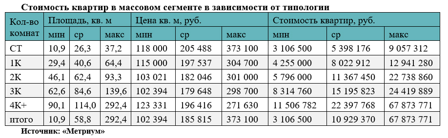 Средние бюджеты предложения выросли по всем типологиям (максимальный рост отмечен на студии – 8,1% и многокомнатные лоты – 9,2%). Прирост по рынку в целом составил 7,8%, таким образом средняя стоимость квартиры в массовом сегменте достигла 10,9 млн руб. (в конце 2019 года – 10,1 млн руб.).