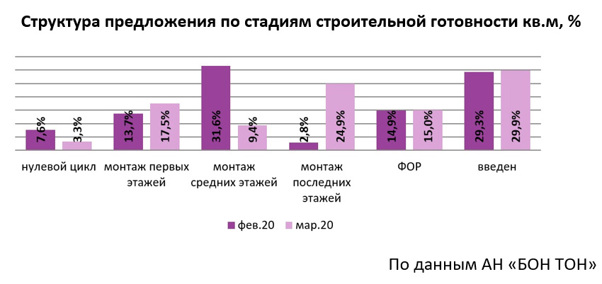 Почти половина предложения по итогам марта находится на заключительных стадиях готовности: 15% относится к новостройкам на этапе ФОР (фасадно-отделочных работ), 29,9% представлено введенными объемами, а 24,9% находится в процессе монтажа последних этажей. Заметим, что по итогам марта такие новостройки показали значительный прирост – доля подскочила с 2,8% до 24,9%, а объем вырос в 9 раз!