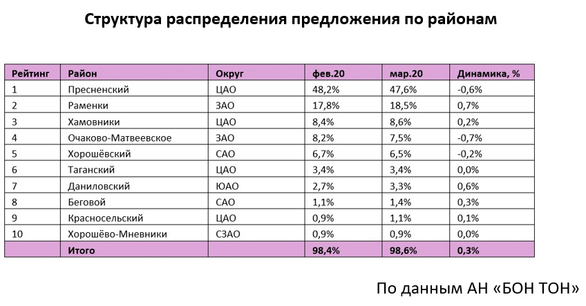 ТОП-10 локаций представлен такими районами, как Пресненский, Раменки, Хамовники, Очаково-Матвеевское, Хорошевский, Таганский, Даниловский, Беговой, Красносельский, Хорошево-Мневники. В общей сложности на данные территории приходится 98,6% рынка квартир премиум-класса. Однако в явных лидерах Пресненский, «забирающий» 47,6% предложения. Также выделяется район Раменки с 18,5%.