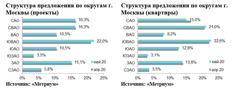 Максимальная доля от общего предложения приходится на ЮВАО (22,6%) и СВАО (21%). За месяц они увеличились на 0,5 и 0,4 п.п. соответственно. За ними следуют САО (15%; -1,4 п.п.) и ЗАО (13,8%; -0,2 п.п.).