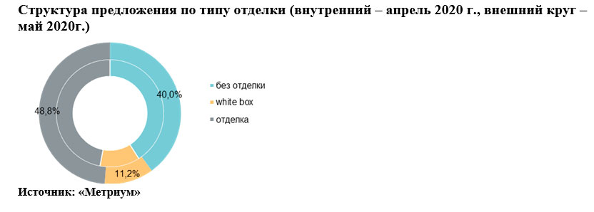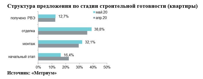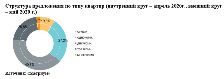 По данным «Метриум», на конец мая 2020 года на первичном рынке жилья массового сегмента велись продажи в 86 жилых комплексах. За отчетный период общий объем предложения по количеству лотов в реализации снизился на 3,9% и составил 13 6451 квартир. Совокупная площадь жилья сократилась на 3,1% – до 804,8 тыс. кв. м.