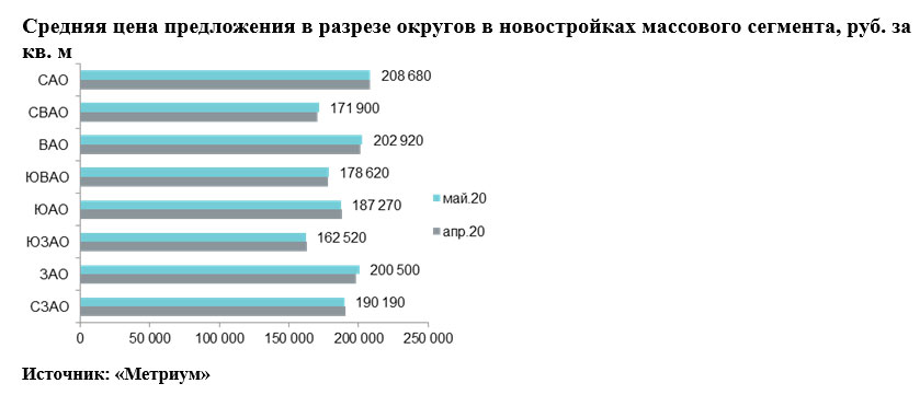По подсчетам аналитиков «Метриум», в мае 2020 года средняя цена квадратного метра составила 187 750 руб. за кв. м, что практически идентично показателю прошлого отчетного периода – прирост составил всего 0,1%. В разрезе округов ценовая ситуация также оставалась стабильной – зафиксированы незначительные колебания цены квадратного метра в пределах ±1%. Основной причиной корректировки цен стало изменение структуры предложения в проектах.