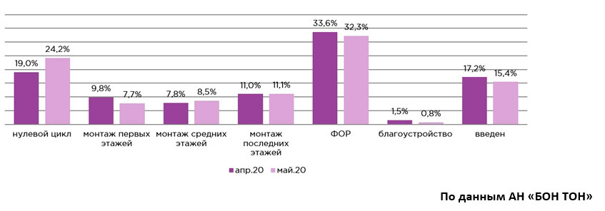 Аналитики АН «БОН ТОН» подвели итоги мая на первичном рынке квартир комфорт-класса и изучили распределение предложения по стадиям строительной готовности. На стадии фасадно-отделочных работ (ФОР) реализуется 32,3% от общего количества квадратных метров. На этапе благоустройства находится 0,8% предложения. Еще 15,4% представлено вводимыми объемами. Несмотря на то, что за месяц доля предложения на заключительных стадиях готовности (ФОР, благоустройство, ввод) снизилась на 3,8%, разница на рынке все еще сохраняется. Для сравнения, на начальной стадии находится 31,9% новостроек, в том числе 24,2% на этапе нулевого цикла.
