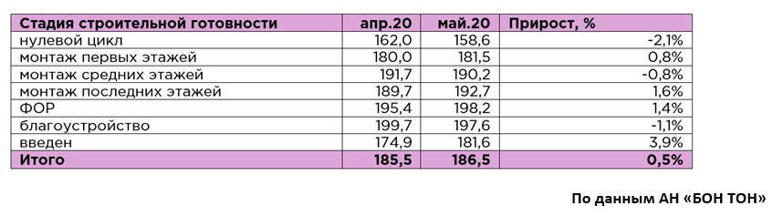 Одновременно аналитики АН «БОН ТОН» наблюдают разнонаправленный вектор движения цен в зависимости от стадии строительной готовности. По итогам мая отмечается понижение СВЦ на старте, что обусловлено выходом в реализацию новых объемов жилья. Также незначительную отрицательную динамику показали новостройки на стадии монтажа средних этажей и благоустройства.