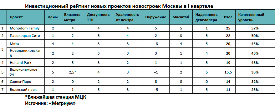 В итоге все баллы суммируются и на их основе выстраивается рейтинг: наверх попадают более удачные проекты для инвестиций, а вниз – менее. Однако, подчеркивают эксперты «Метриум», топовая позиция еще не означает, что новостройка подходит для инвестирования. Иногда среди новинок вовсе нет подходящих объектов. Поэтому итоговый рейтинг соотносится с максимально возможной оценкой, которая составляет 44 балла. Такую оценку может получить гипотетическая «идеальная» новостройка, которая однозначно подходит для вложений. Именно соотношение итогового балла с гипотетическим максимумом даёт представление о качественном уровне проекта вообще (а не в сравнении с другими) и, как следствие, его инвестиционной привлекательности. Такая оценка выражается в процентах. К примеру, лидер рейтинга первого квартала (ЖК Monodom Family) соответствует гипотетическому идеалу на 57%, а аутсайдер («Волжский парк») – только на 25%.