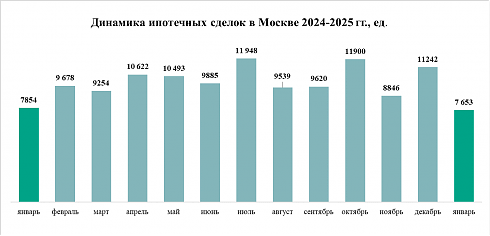 На ипотечном рынке в январе 2025 было зарегистрировано 7,7 тыс. кредитных сделок, что на 3% меньше, чем в январе 2024 года (7,9 тыс. соглашений), и на 32% меньше, чем в декабре 2024 года, когда количество соглашений между банками и заемщиками составило 11,2 тыс. По уровню активности покупателей январь 2025 года уступил январю 2022 года (8,4 тыс. сделок) и январю 2024 года (7,9 тыс.), а все прочие сопоставимые периоды – превзошел.