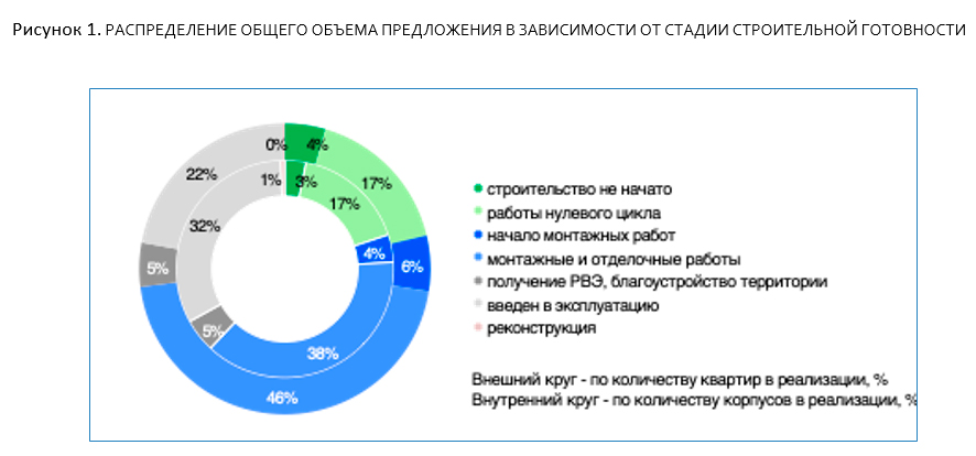 Из этого объема экспозиции более половины лотов реализуется в проектах, находящихся на стадии монтажно-отделочных работ, в уже сданных домах предлагается 22% от общего количества квартир и апартаментов в продаже, однако доля предложения в проектах на начальных этапах строительства (работы не начаты и нулевой цикл) тоже значительная – 21% (рисунок 1).