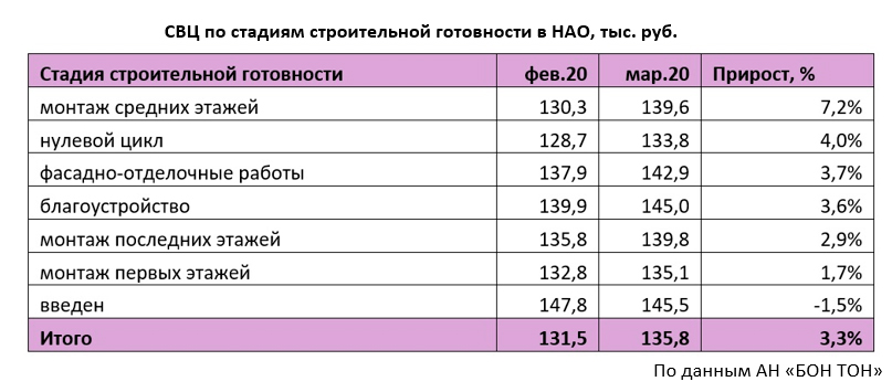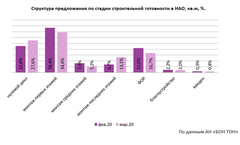 Основная доля предложения в НАО (62,2%) находится на начальной стадии строительной готовности (котлован и первые этажи). За месяц доля предложения на нулевом цикле выросла на 4,7%, а объем – на 30% в связи с выходом нового предложения. Но это не способствовало снижению средней цены «квадрата», т.к. застройщики выводили новые объемы с более высокой ценовой базой. В марте отмечается прирост СВЦ на стадии нулевого цикла на 4%, с 128,7 тыс. руб. до 133,8 тыс. руб.