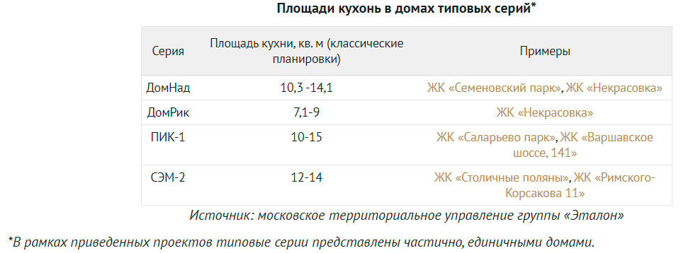 А в новомосковских проектах «Бунинские луга» и «Саларьево парк», где используются дома серии ПИК-2 и ПИК-3, площадь кухонь при классической планировке составляет около 10-12 кв. м (данные компании «Миэль-Новостройки»).