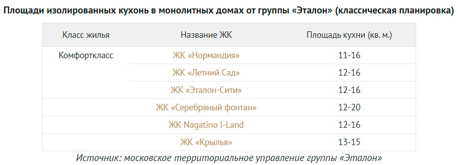 В монолитных домах все изолированные кухни имеют неплохие «человеческие» метражи, но многое зависит от класса жилья: в массовом сегменте при классической планировке их площади варьируется от 11 до 16 кв. м, в бизнес-классе – 12-20 кв. м, отмечают эксперты московского территориального управления группы «Эталон» и приводят примеры из «портфеля» компании (см. таблицу):