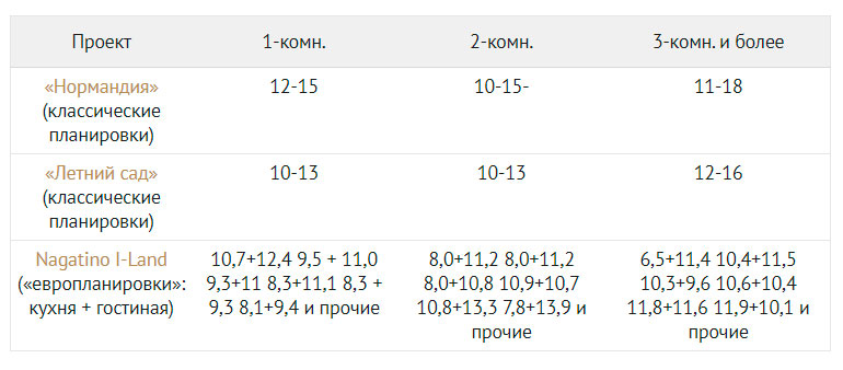 Так, в ЖК «Серебряный фонтан» (метро «Алексеевская») площадь кухни в лотах «евроформата» – 17-24 кв. м, в ЖК Nagatino I-Land в Даниловском районе – 16-24 кв. м, в ЖК «Крылья» (Раменки) – 24 – 28 кв. м.