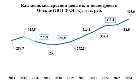 Средняя цена квадратного метра на первичном рынке Москвы во II квартале 2024 года составляет 465,6 тысяч рублей. По данным «Метриум», за прошедшие пять лет этот показатель вырос на 70,9%. Для сравнения, в 2014-2019 гг. квадратный метр в столичных новостройках, напротив, подешевел на 4,3%.