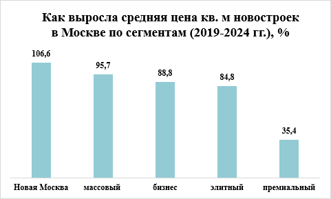 В 2019-2024 гг. рост цен охватил весь первичный рынок Москвы. Но в разрезе сегментов динамика выглядит неоднозначно. Согласно данным «Метриум», в массовом сегменте за минувшие пять лет квадратный метр подорожал на 95,7% (до 326,1 тысяч рублей), в бизнес-классе – на 88,8% (до 449,7 тысяч рублей), в премиум-классе – на 35,4% (до 663,8 тысяч рублей), в элитном сегменте – на 84,8% (до 1,8 млн рублей), в Новой Москве – на 106,6% (до 245 тысяч рублей).