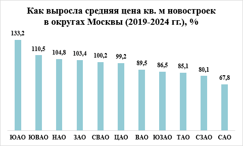 За последние пять лет цены на рынке первичного жилья существенно выросли не только во всех сегментах, но и во всех округах Москвы. И все же темпы удорожания отличаются. Максимальный рост цен зафиксирован в ЮАО (+133,2%), минимальный – в САО (+67,8%).