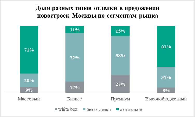 По подсчетам аналитиков «Метриум», с 2020 года порядка 61% проданных в московских новостройках квартир и апартаментов предполагали отделку от застройщика (включая white box). Чаще всего помещения с готовым дизайнерским решением от застройщика предпочитали покупатели массовых и высокобюджетных новостроек в Москве.