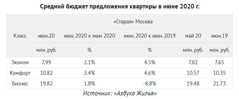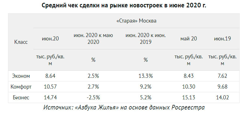 Согласно подсчётам «Бон Тон», цены выросли еще более существенно - в связи с увеличением стадии строительной готовности проектов, активизацией спроса и снижением ипотечных ставок. По данным компании, в июне 2020 г. средневзвешенная цена квадратного метра на рынке новостроек комфорткласса «старой» Москвы составила 183,8 тыс. руб., что на 3% и 17% больше, чем, соответственно, в мае 2020-го и июне 2019-го. Бизнес-класс в июне стоил в среднем 240,5 тыс. руб. за метр, то есть подорожал на 4,6% и 16,3%.