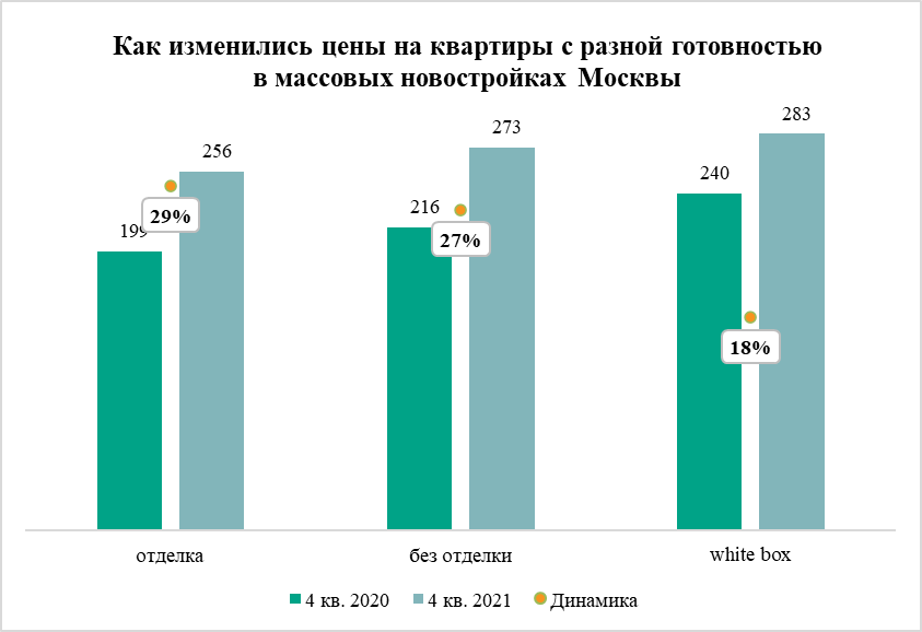 В феврале 2021 года средняя стоимость квартиры с отделкой в массовых (эконом- и комфорт-класса) новостройках Москвы составила 256 тыс. рублей за кв. м. Между тем в аналогичный период 2020 года такое жилье можно было приобрести в среднем за 199 тыс. рублей за кв. м. Таким образом, за 12 месяцев квартиры в массовых новостройках Москвы с отделкой от застройщика подорожали на 29%.