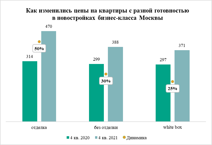 В жилых комплексах бизнес-класса в Москве наблюдались такие же тенденции. За 2021 год квартиры с отделкой в новостройках бизнес-класса в Москве стали дороже на 50%. Если в феврале средняя стоимость квадратного метра в них составляла 314 тыс. рублей, то в конце февраля этот показатель вырос до 470 тыс. рублей.