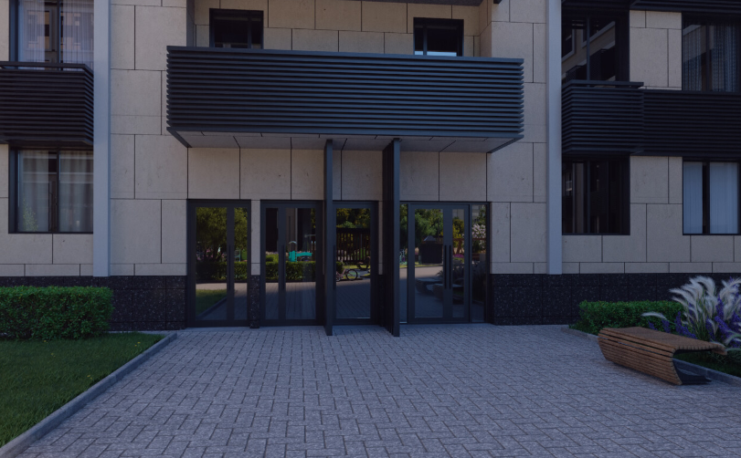 В жилых комплексах эконом- и комфорт-класса используются алюминиевые конструкции. В домах более высокого класса создаются входные группы из цельного стекла: металлические коннекторы в них незаметны. В некоторых комплексах строят входную группу из спайдерного стекла, которые вовсе обходятся без металлического каркаса.