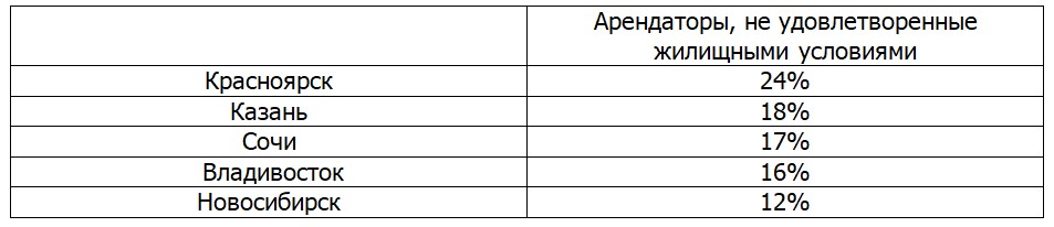 Арендаторы во Владивостоке и Новосибирске чаще всего жалуются на отсутствие ремонта или невозможность его сделать, семьи в Казани не удовлетворены высокой арендной платой, а в Красноярске и Сочи — шумоизоляцией в квартирах. При этом большинство арендаторов отнесли к числу обязательных требований к жилью наличие стиральной машины, ремонта, мебели, кухни со встроенной техникой и подключения к интернету.