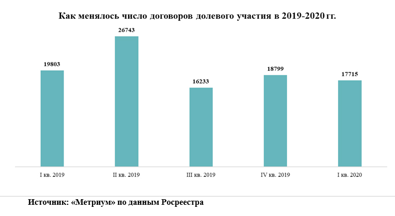 В I квартале 2020 года на рынке долевого строительства Москвы было заключено 17,7 тыс. сделок. По сравнению с I кварталом 2019 года их количество сократилось на 11%, хотя, отмечают аналитики «Метриум», последние два квартала 2019 года были более провальными в годовом выражении (тогда число зарегистрированных договоров долевого участия снизилось соответственно на 19% и 27%).