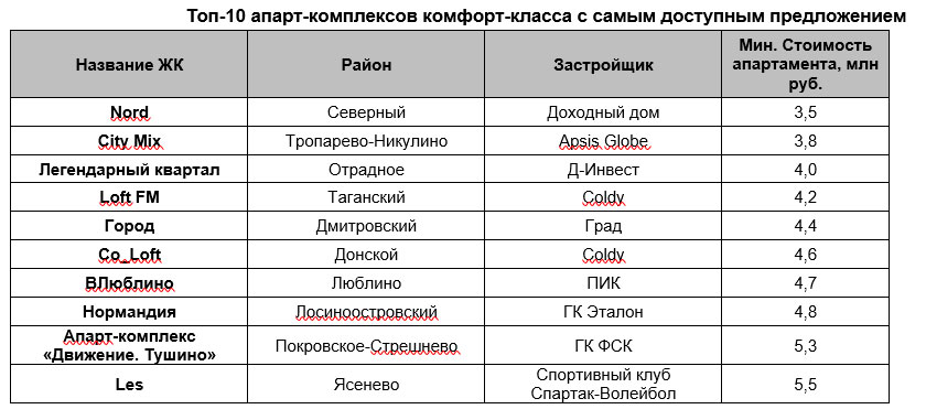 Самые доступные апартаменты реализуются в ЖК Nord, их стартовый бюджет составляет 3,5 млн рублей. Стоит отметить, что за период самоизоляции «входной билет» на рынок апартов подорожал – в марте 2020 года в ЖК Yantar Apartments стоимость лота начиналась от 3,2 млн рублей. Апартаменты бюджетом до 4 млн рублей можно приобрести в проектах Citi Mix и «Легендарный квартал». Объекты, стоимость которых превышает 5 млн рублей, представлены только в двух комплексах из десяти – это апарт-комплекс «Движение. Тушино», в котором начальная стоимость составляет 5,3 млн рублей, и ЖК Les - цены от 5,5 млн рублей.