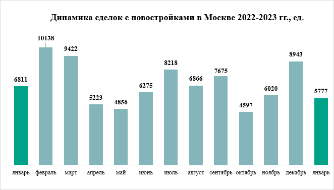 В январе 2023 года Росреестр Москвы зарегистрировал 5,8 тыс. договоров участия в долевом строительстве (ДДУ) жилья в столице. Это на 15% меньше, чем в январе 2022 года, когда было зафиксировано 6,8 тысяч сделок на рынке строящегося жилья.