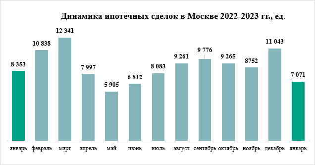 Количество ипотечных сделок, зарегистрированных в Москве в январе 2023 года, составило 7,1 тысяч соглашений. Относительно января 2022 года, когда были зафиксированы 8,4 тысяч договоров между покупателями жилья и банками, спрос со стороны заемщиков снизился на 15%. По сравнению с декабрем 2022 года клиенты совершили на 36% меньше сделок с использованием заемных средств. Однако за год доля ипотечных сделок ощутимо выросла, особенно на первичном рынке.