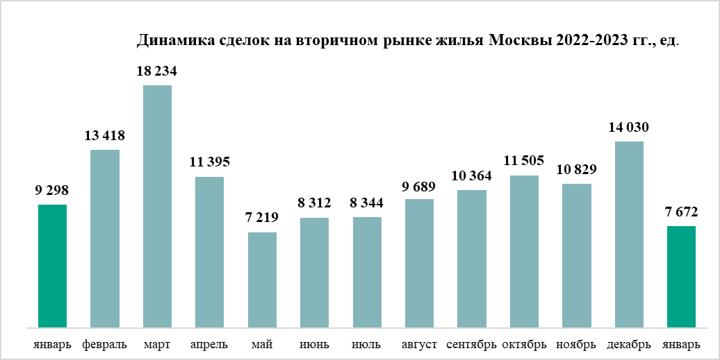 На вторичном рынке жилья в Москве активность покупателей в начале 2023 года также снизилась. В январе зарегистрировано 7,7 тысяч договоров купли-продажи, тогда как годом ранее – 9,3 тысяч. Таким образом, спрос на вторичное жилье упал на 17% год к году. Относительно декабря 2022 года количество сделок сократилось на 45%, то есть сильнее, чем на рынке строящегося жилья.