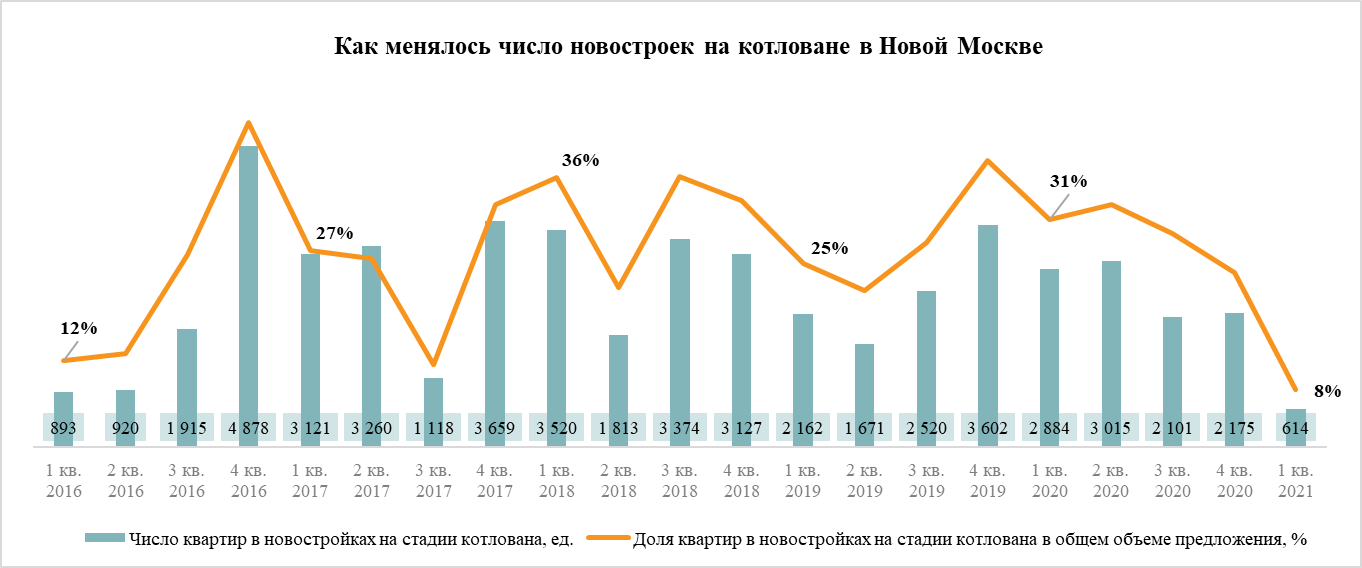 В I квартале 2021 года в Новой Москве девелоперы строили 33 жилых комплекса, в которых покупателям предлагались 7,9 тыс. квартир в корпусах на разной стадии строительства – от котлована до готовых домов. Из них на раннем этапе строительства было немногим более 600 вариантов квартир, что составило 8% от общего объема предложения. По наблюдениям аналитиков «Метриум», это минимум за последние 5 лет.